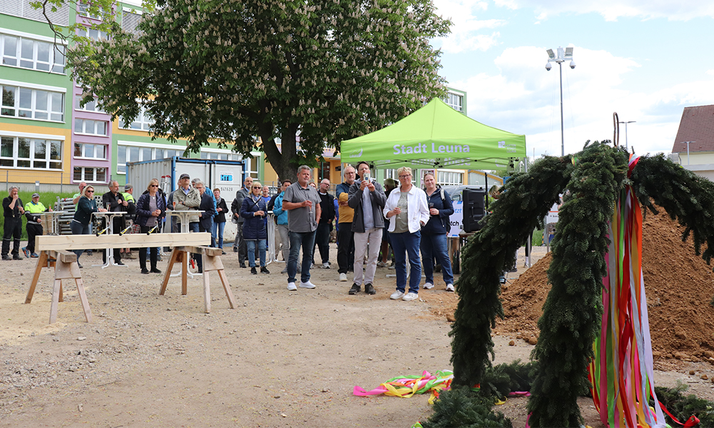 Mit einer Grundsteinlegung startete der Neubau einer Kindertageseinrichtung im Leunaer Ortsteil Zöschen am 16. Januar 2025. Fünf Monate später, am 16. Mai, wurde Richtfest gefeiert.